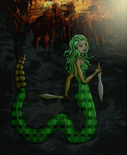 After I was done drawing Medusa I went online and found some stalactite photos and a cave floor photos. Than I used the selection tool in Photoshop Cs5.5 and I put them both in one file on a black background in Photoshop.